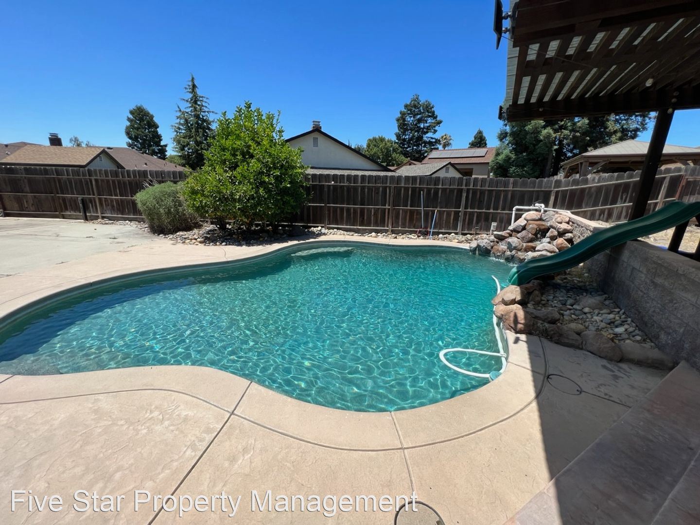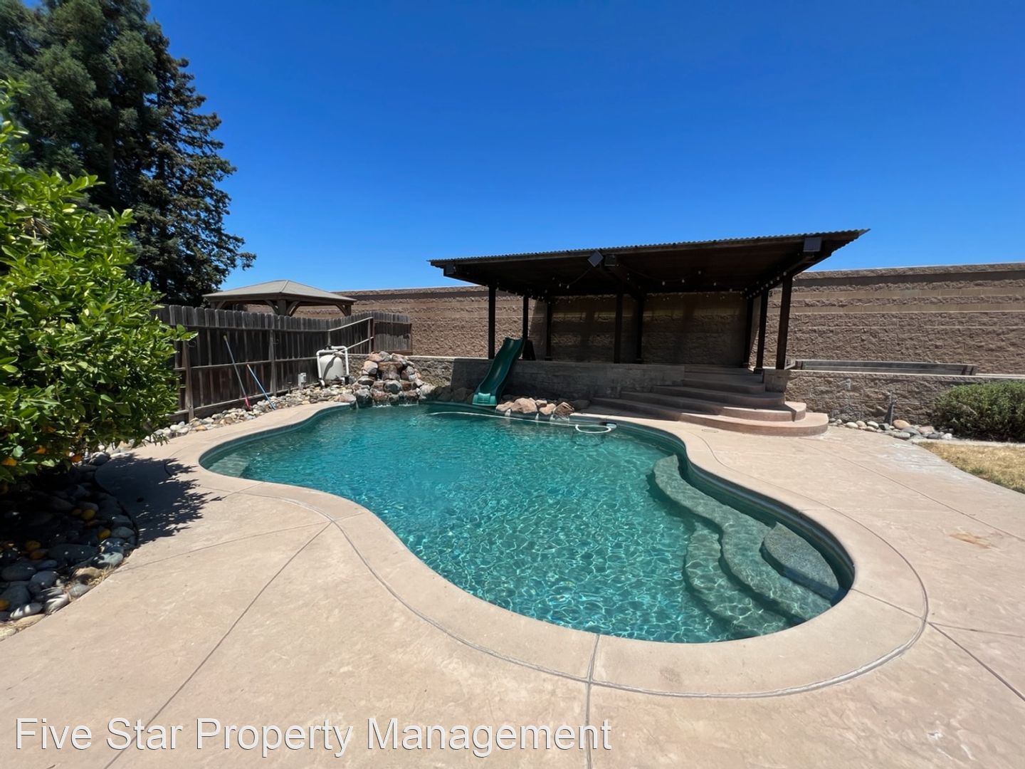 3 bedroom single story with a pool! - Wonderful family home in the desirable north side of Manteca. Be sure to check out the walking video tour on our YouTube channel. Single story with 3 Bedrooms, 2 full baths and attached two car garage. Primary suite has a walk-in closet, large, tiled shower and double vanities with Quartz counters. Very large yard is almost an 11,000 square foot lot. Refreshing in-ground pool with waterfall feature. Gated RV or boat parking. Large, raised garden area or a perfect spot for cornhole and summer games. Custom gazebo/cabana in yard along with large patio and uncovered area next to pool. Home features recently updated kitchen and laundry room with granite counters and extra deep sinks. The kitchen features casual counter dining and large dining area for family fun. Upgraded stainless appliances (Fridge included without warranty). Large community park is right across the street! This location is also very close to shopping and not far from the freeway. Tenant is responsible for yard and pool maintenance and all utilities. Rent is $2750/month with a one-year lease and $3000 security deposit. Pets are subject to approval and would require an increased deposit. Please apply online where there is a $45 non-refundable application fee. Please visit our website at HomesbyFivestar.com or call 209-544-9000 for more information. Five Star Property Management Lic# 01933920 2132 Wylie Dr Modesto, CA 95355 209-544-9000 office 209-544-9009 fax info@HomesbyFivestar.com HomesbyFivestar.com