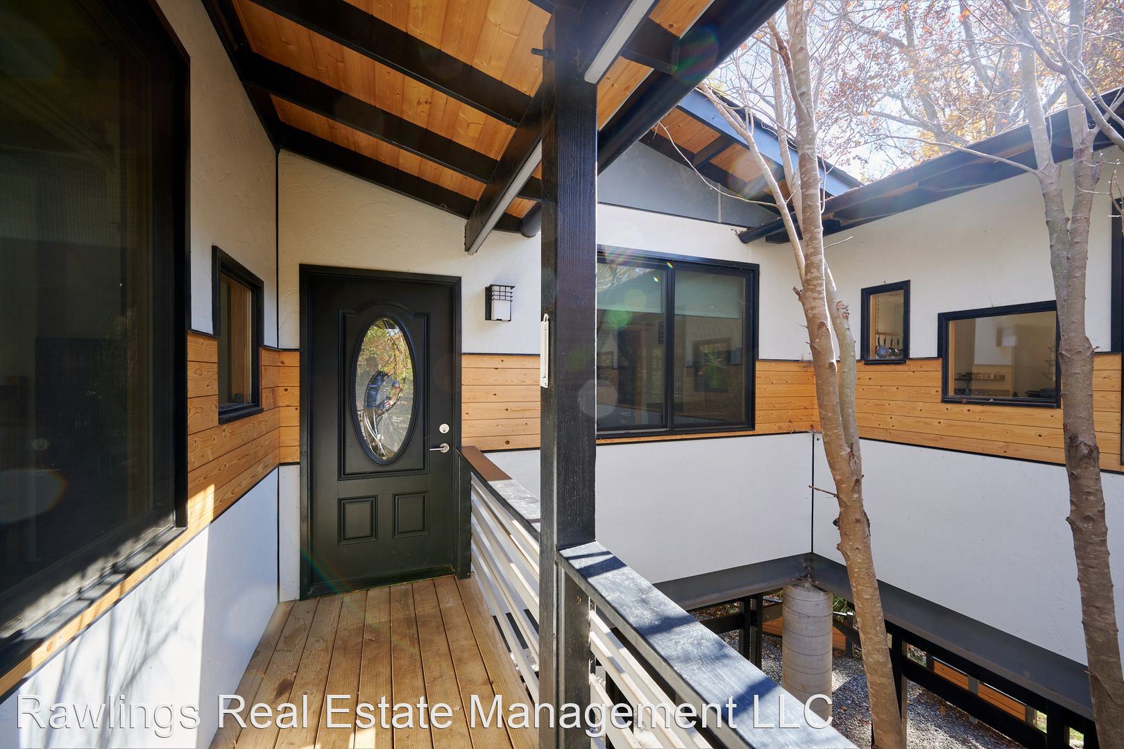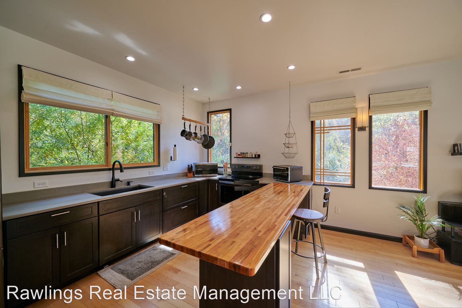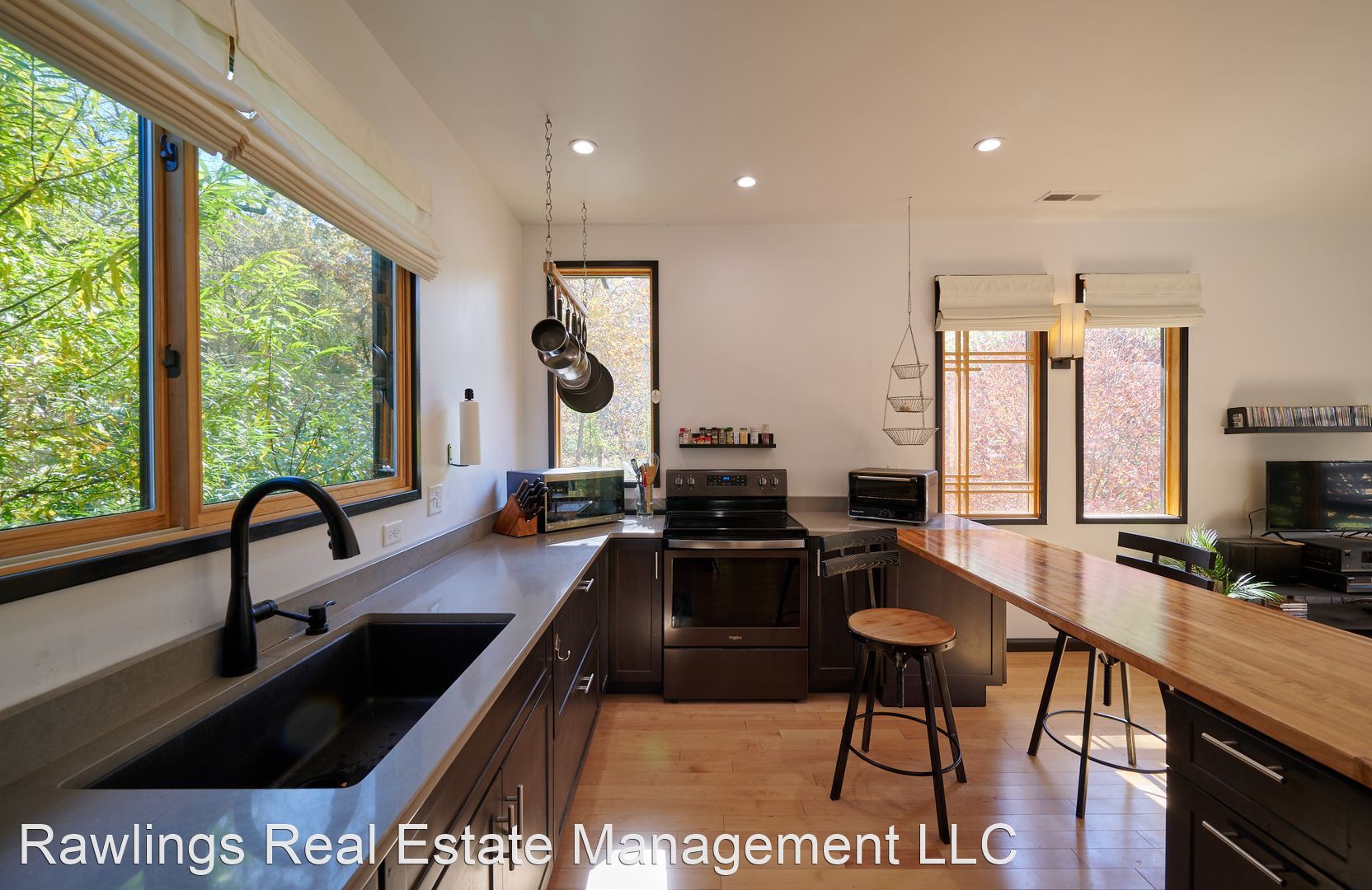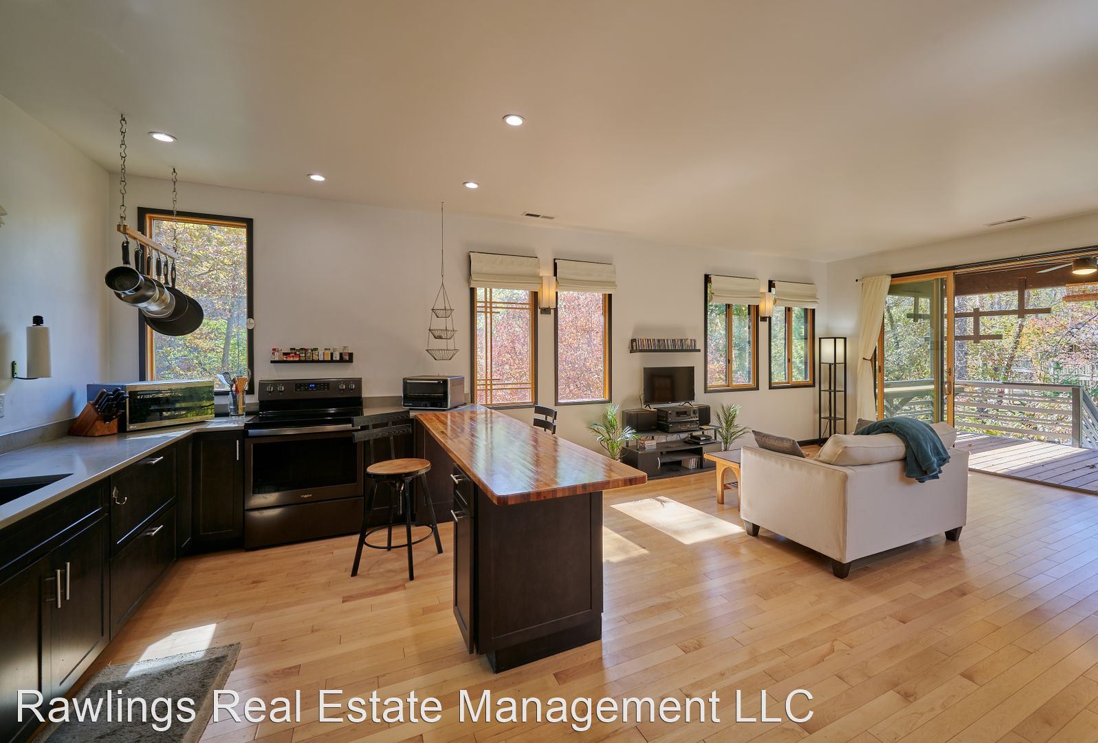 Indoor spaces receive wonderful natural light, and natural wood elements including hardwood floors are throughout. Two spacious living areas, one of which is open with the kitchen, can be configured as your living room, dining room, or office. The open kitchen has wood block and solid surface countertops, nice cabinetry with deep drawer storage, and a walk-in pantry. Kitchen appliances include the refrigerator and electric range.